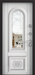 Белая входная дверь с зеркалом с повышенной звукоизоляцией и темной фурнитурой снаружи №21