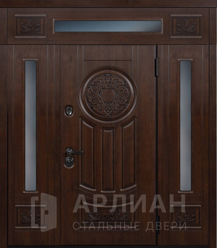 Металлическая входная дверь в коттедж с верхней фрамугой №10