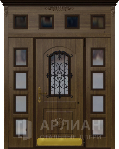 Двухстворчатая входная дверь со стеклом и ковкой №9