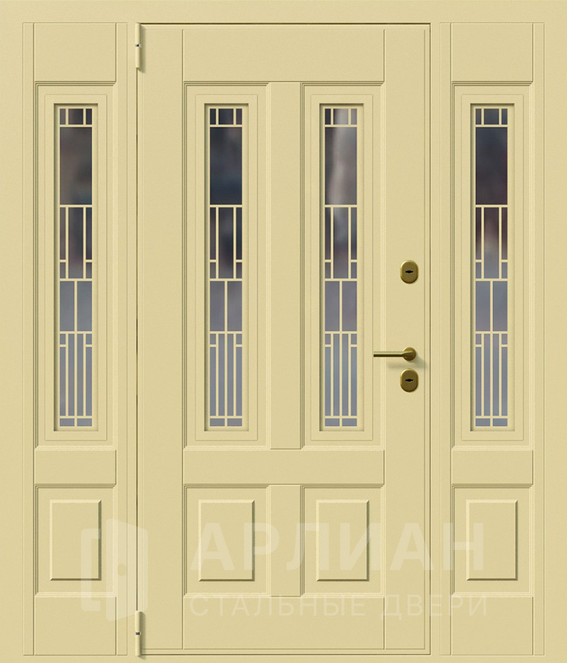 Высокая арочная дверь с фрамугой и кованой решеткой №12