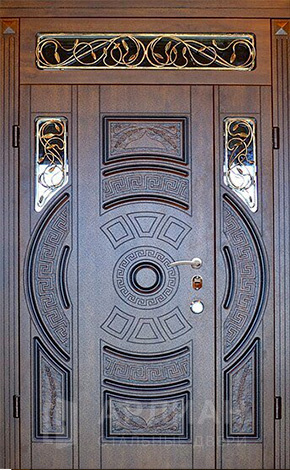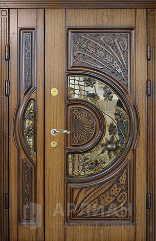 Кованая арочная входная дверь со стеклом и ковкой №69