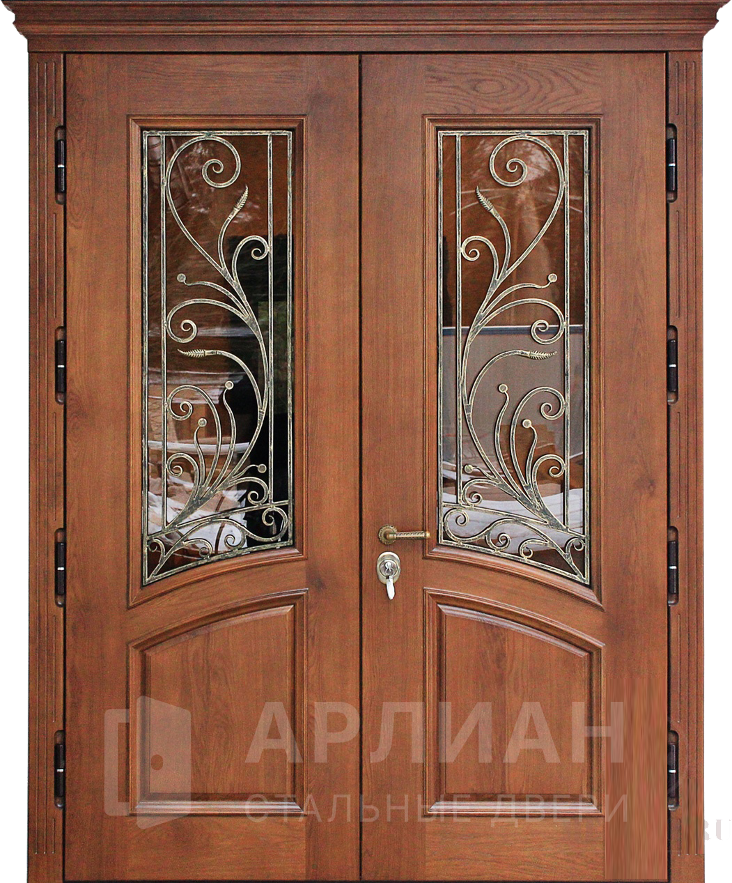 Высокая арочная дверь с фрамугой и кованой решеткой №12