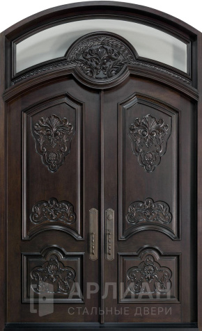 Кованая арочная входная дверь со стеклом и ковкой №69